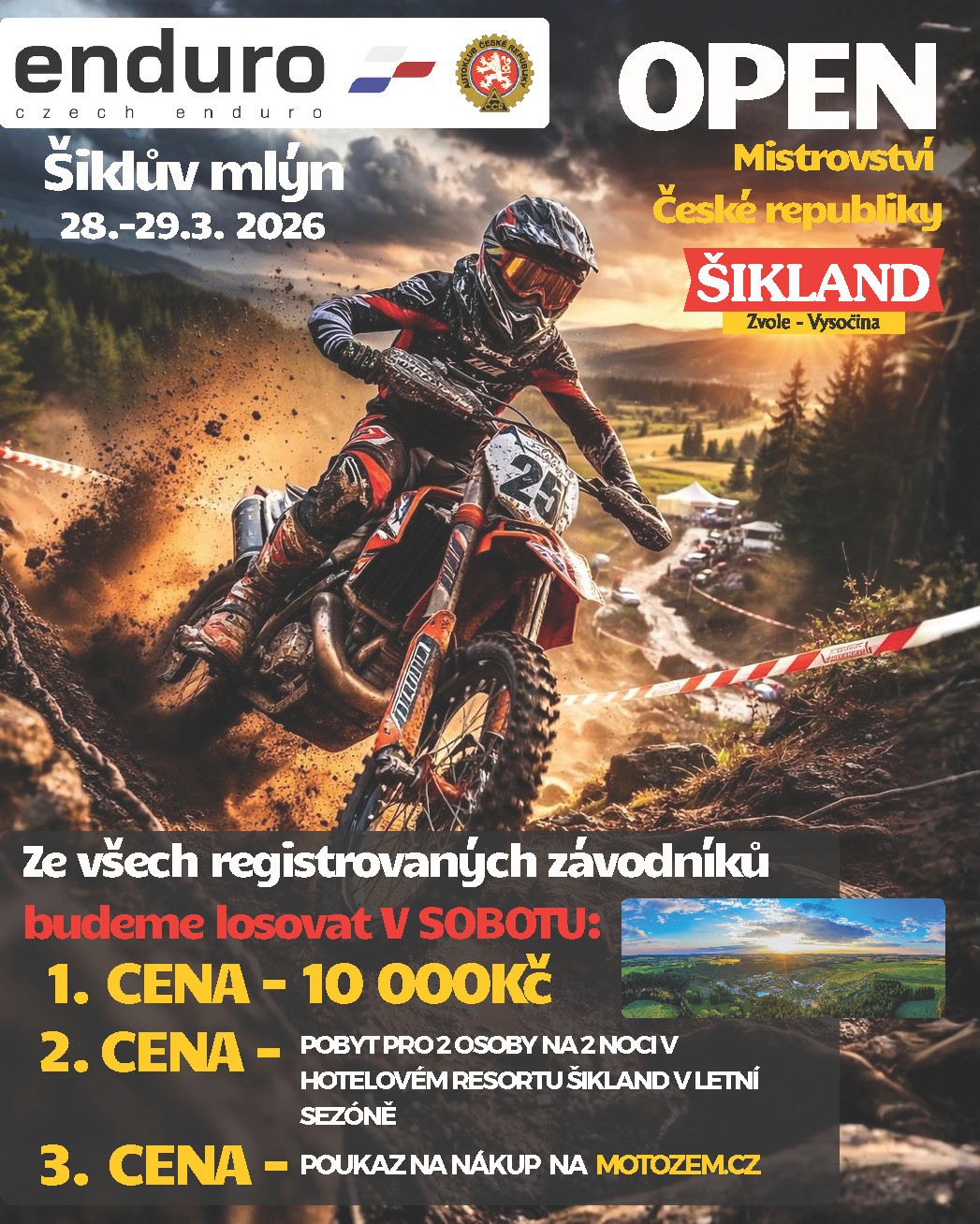 O víkendu 28.–29. března 2026 se v Šiklově mlýně uskuteční úvodní podnik seriálu CZECHENDURO 2026 - OPEN MČR, Přebor ČR a POHÁR ŠIKLOVA MLÝNA.